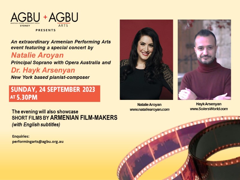 An extraordinary cultural event featuring a special concert by Natalie Aroyan, Principal Soprano of Opera Australia and Dr. Hayk Arsenyan, Armenian native, New York based pianist-composer. Alongside this concert and performances by AGBU Tamzara Dance Group will be 6 Armenian produced short films.