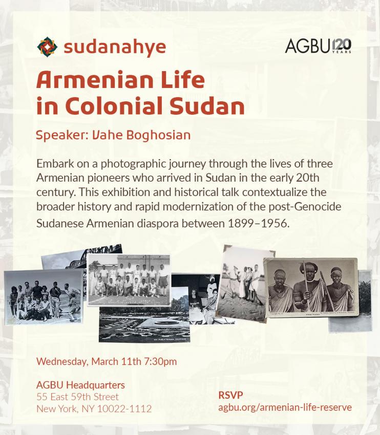 Join AGBU Arts and Sudanahye director, Vahe Boghosian, at the AGBU Central Office for a discussion surrounding Armenian Life in colonial Sudan as preserved through archival photographs and oral history. Light refreshments will be served.