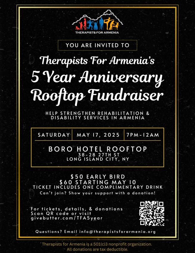 Therapists for Armenia, a non-profit organization of rehab therapists volunteering to improve disability and healthcare services for Armenians, is celebrating its 5-Year Anniversary with a rooftop fundraising event.